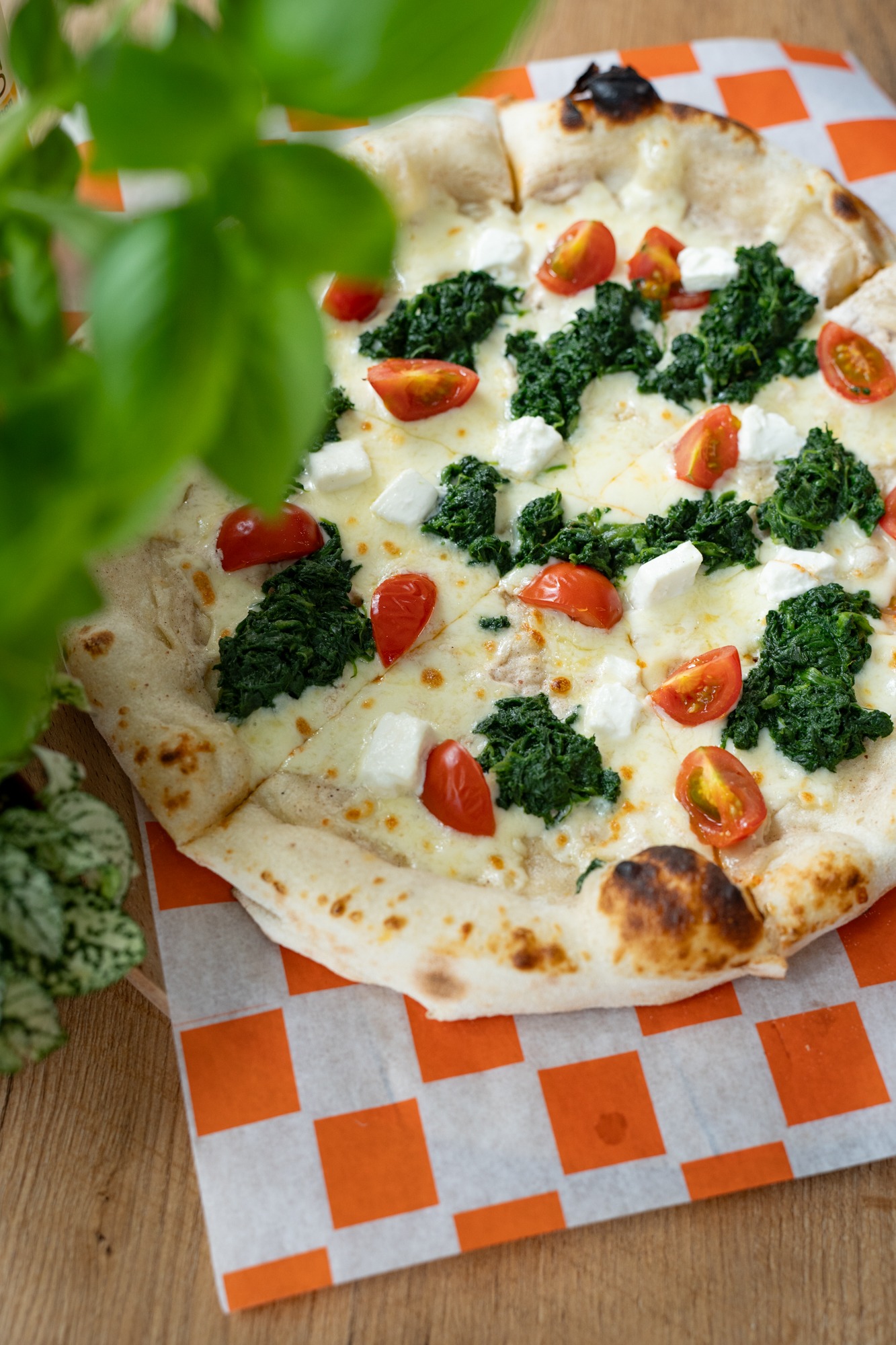 sos śmietanowy, mozzarella, blanszowany szpinak, ser feta, pomidorki