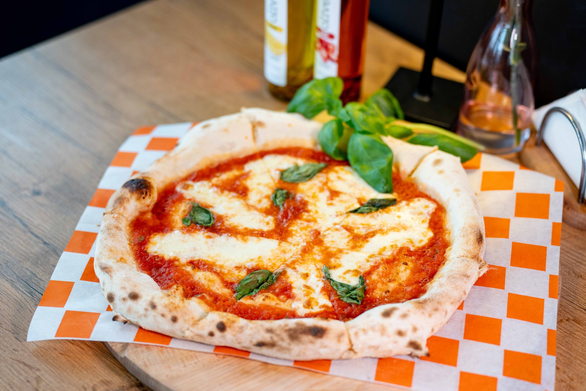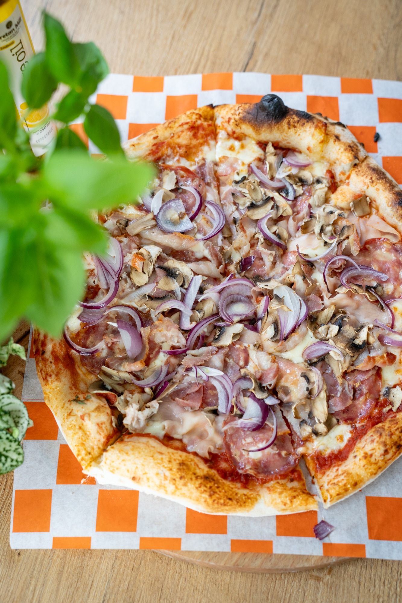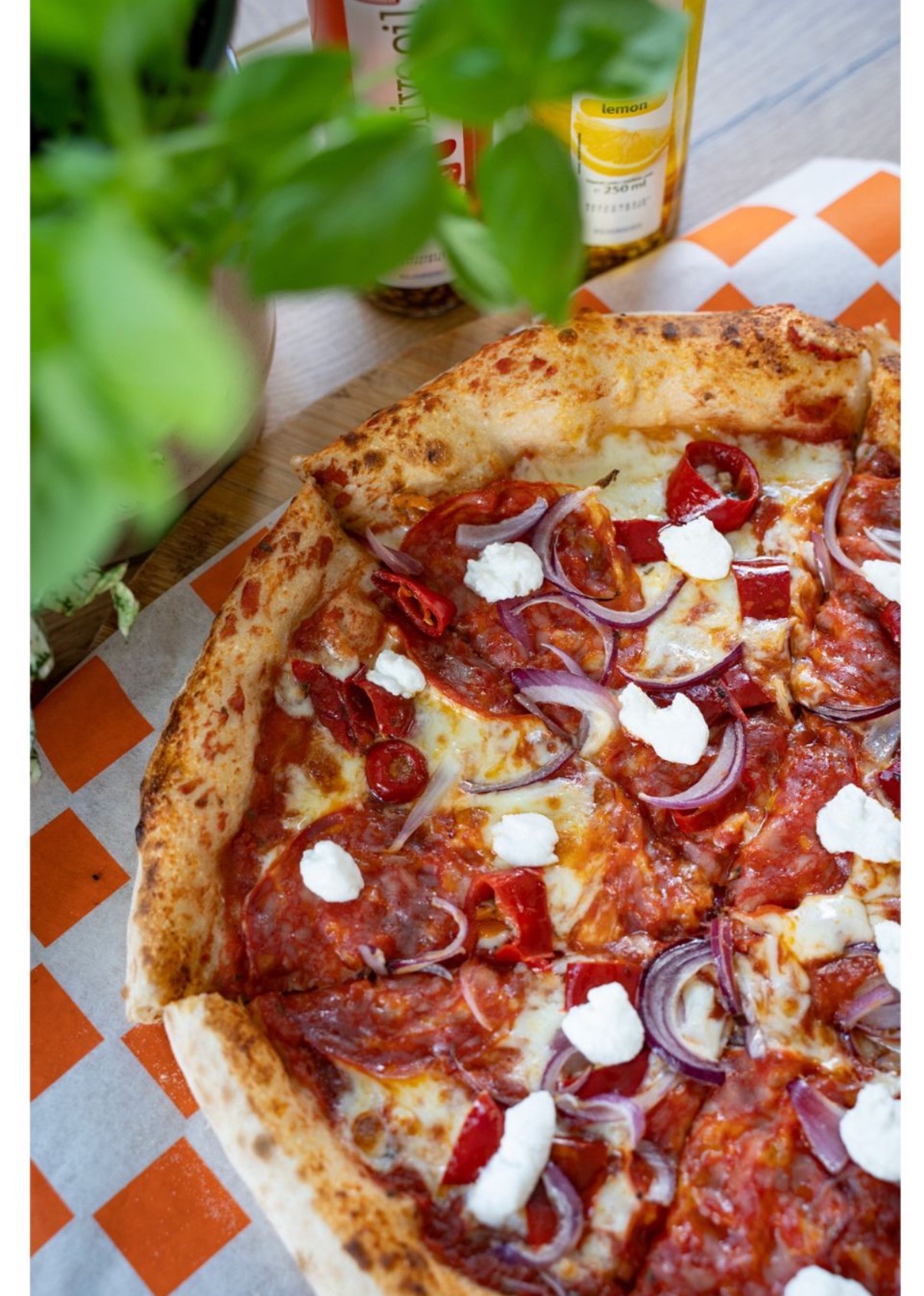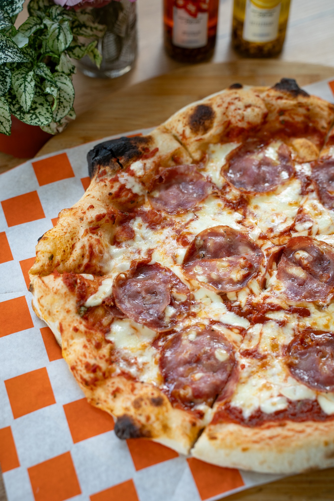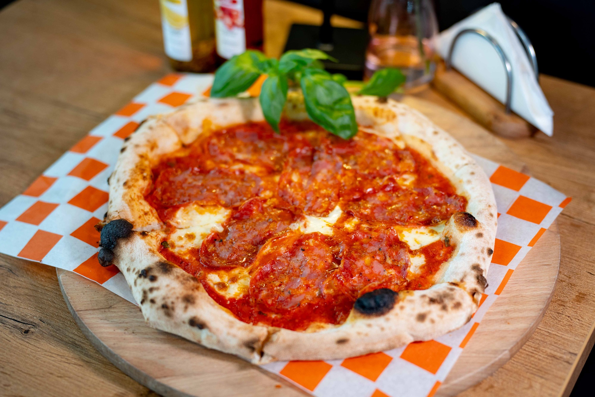 sos z włoskich pomidorów pelati, mozzarella, salami spianata, oliwa czosnkowa