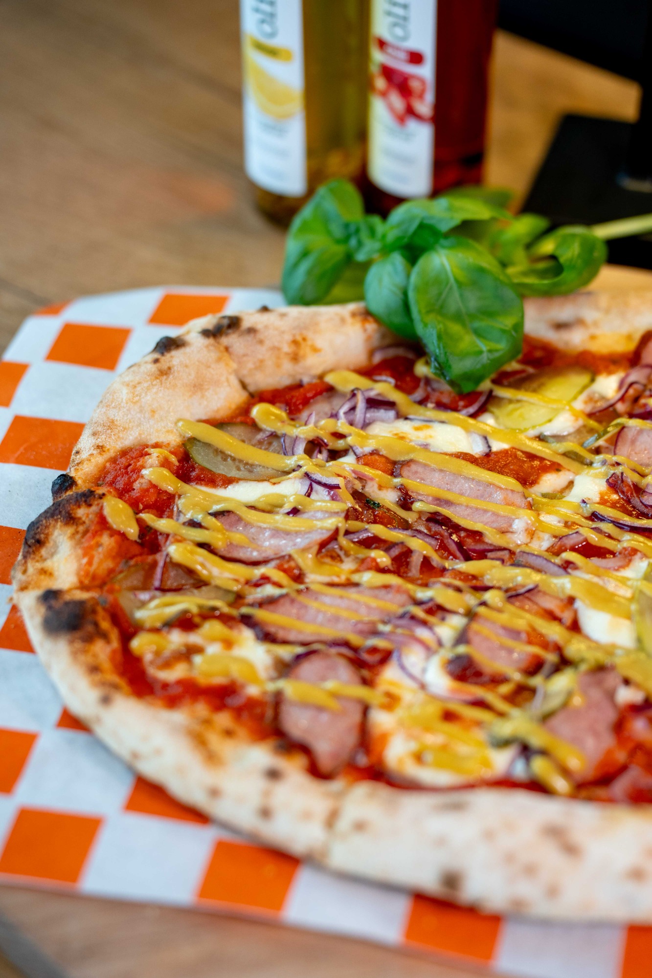 sos z włoskich pomidorów pelati, mozzarella, kiełbasa wędzona, cebula, ogórek konserwowy, musztarda miodowa
