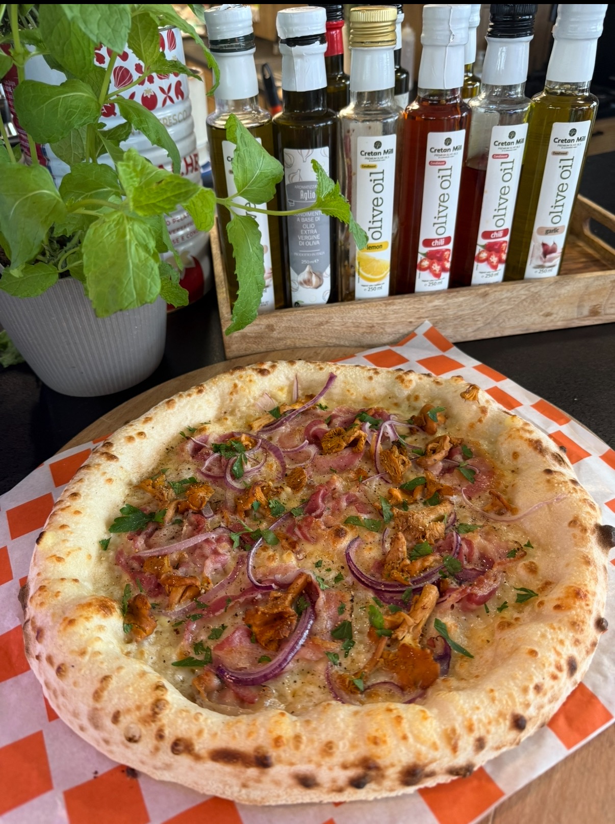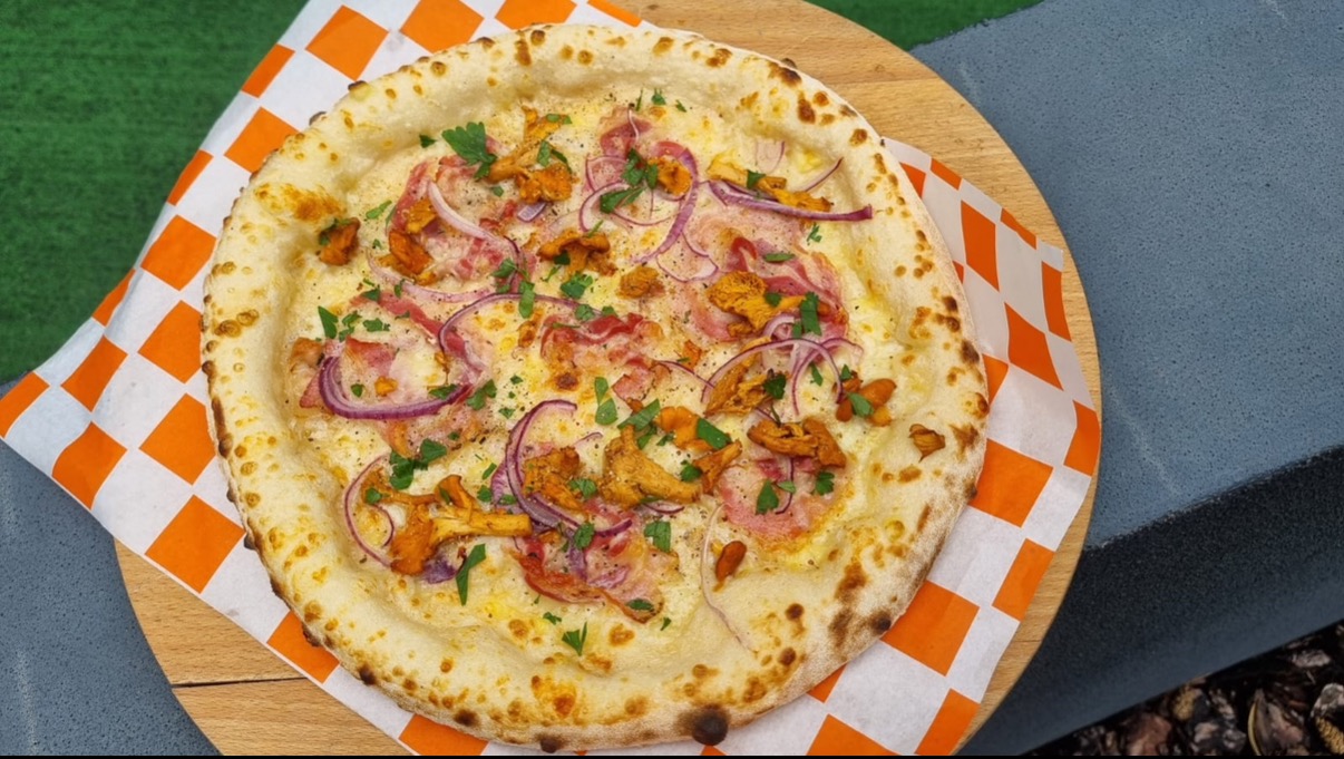 sos śmietanowo parmezanowy, mozzarella, włoski boczek pancetta, gorgonzola, bazylia, suszone pomidory -
