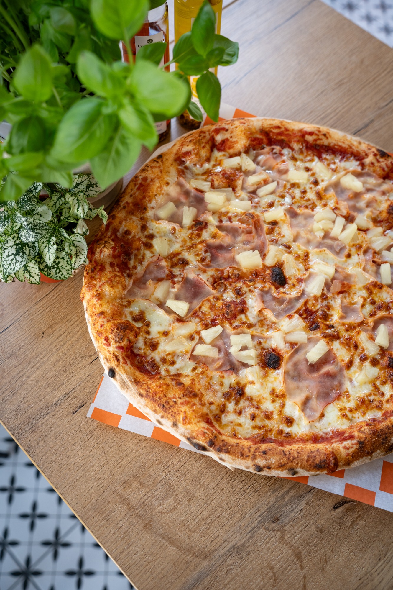 sos z włoskich pomidorów pelati, mozzarella, prosciutto cotto, ananas