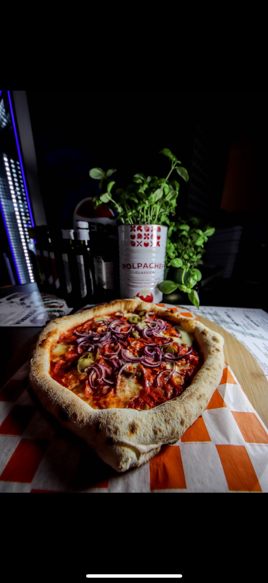sos z włoskich pomidorów pelati, mozzarella, salami pikantne ventricina, cebula, ostre papryczki, mascarpone