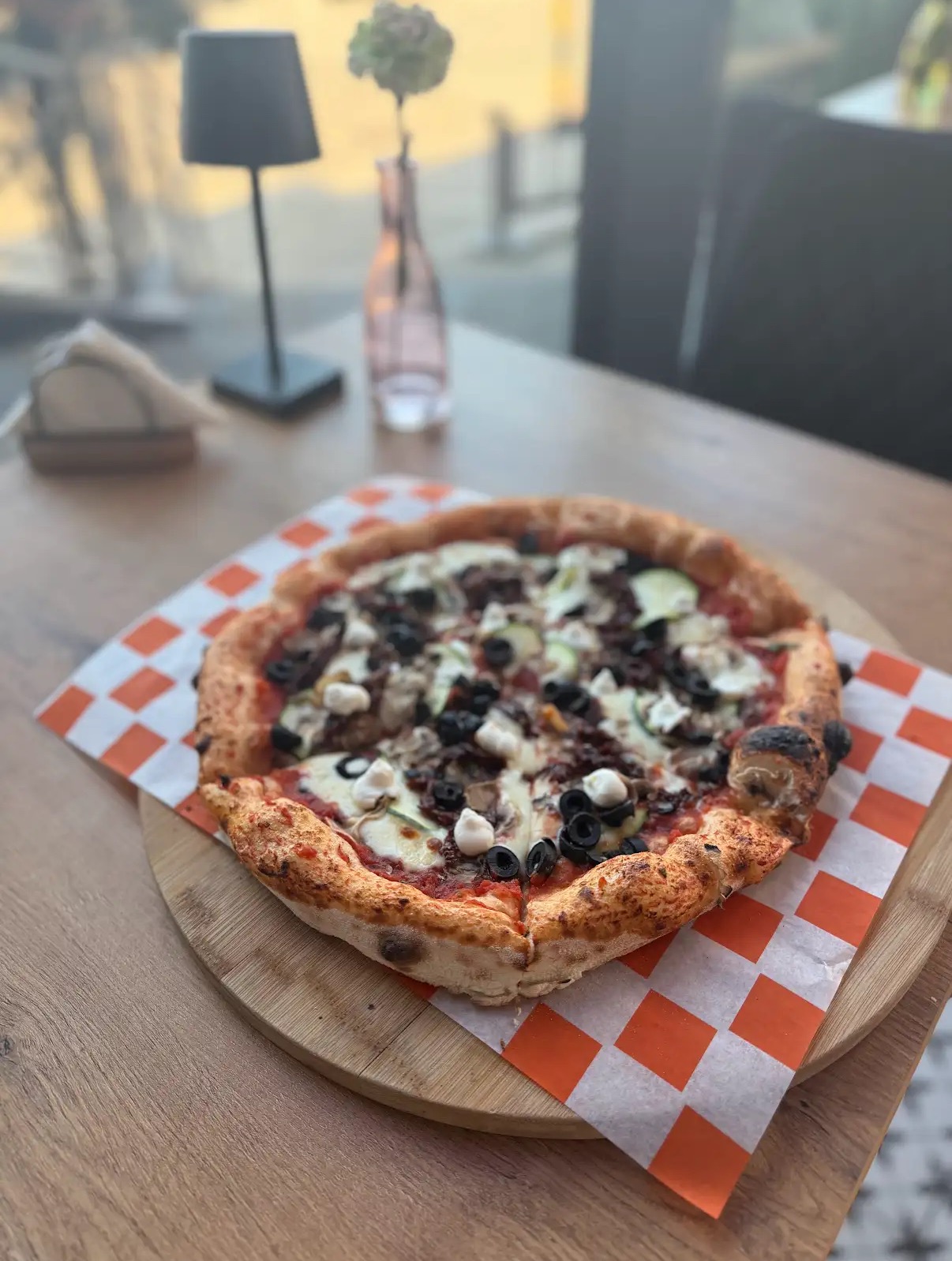 sos z włoskich pomidorów pelati, mozzarella, cukinia, suszone pomidory, oliwki, pieczarki, ricotta